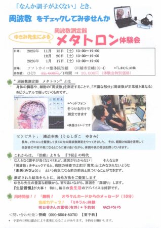 2024.10.31 / 最終更新日時 : 2025.2.3 softkairo-admin イベント 周波数測定器 ”メタトロン体験会” 周波数測定器メタトロン で「脳の血流」をチェック 周波数測定器メタトロンは、周波数の乱れをチェックして、病院の検査では異常がでない乱れを探し出すことができます。そのあと、生活習慣などへのアドバイスをします。チェックのあと