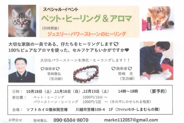 2025.10.6 / 最終更新日時 : 2025.10.6 softkairo-admin イベント ペット・ヒーリング&アロマ お宅のかわいい猫ちゃん、ワンちゃんは元気ですか? 大切な家族の一員である仔たちをヒーリングします 日時: 2025年 10月15日(土), 14時から18時 (要 予約) 11月16日(日) 14時から18